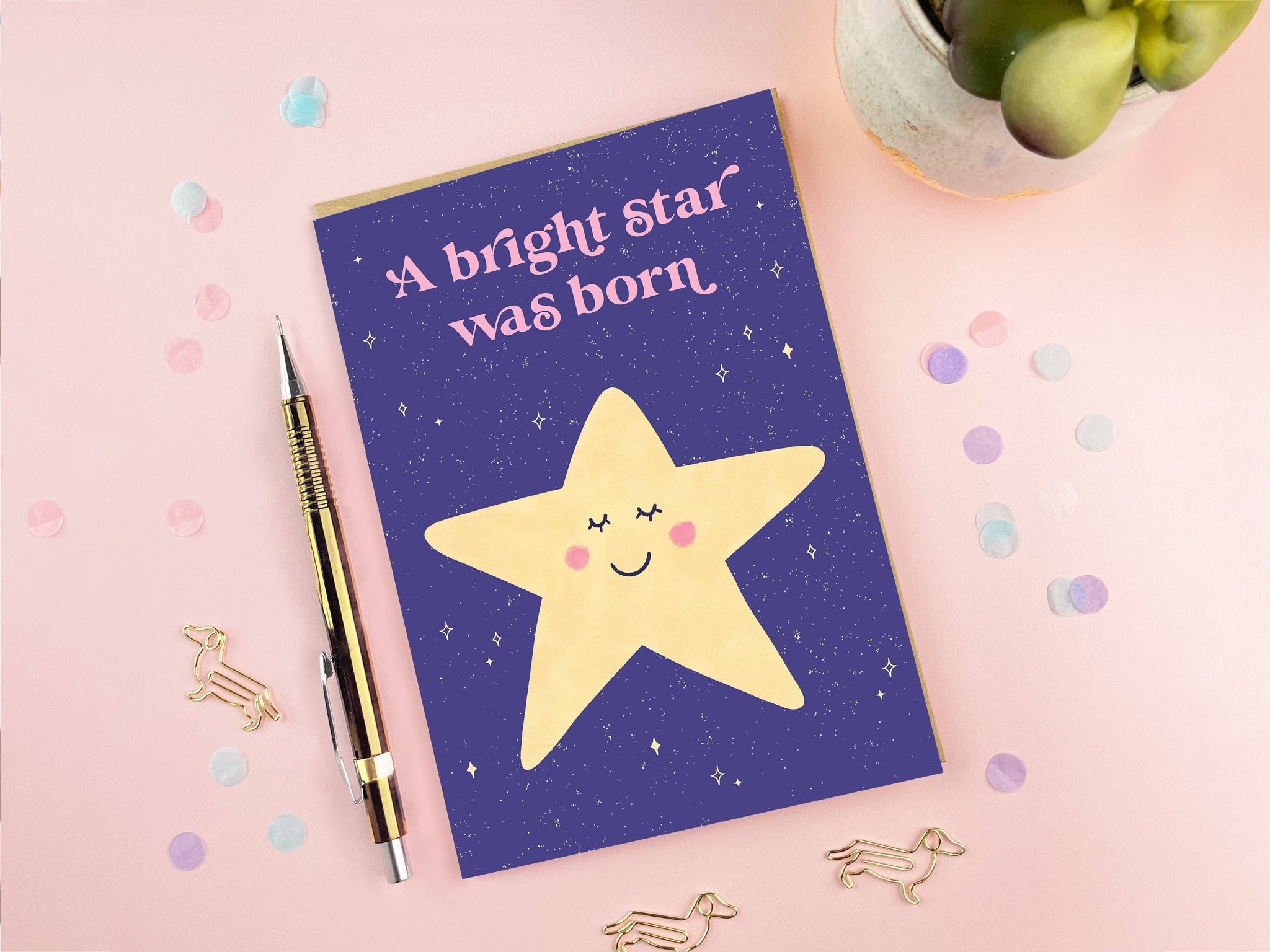 Welcome a brand new superstar to the family constellation with this new baby card! The gender-neutral new baby card features an adorable illustrated star with a sweet smile, on a midnight blue background. Over the top, the new parent card’s pink caption reads “A bright star was born” in a retro font.