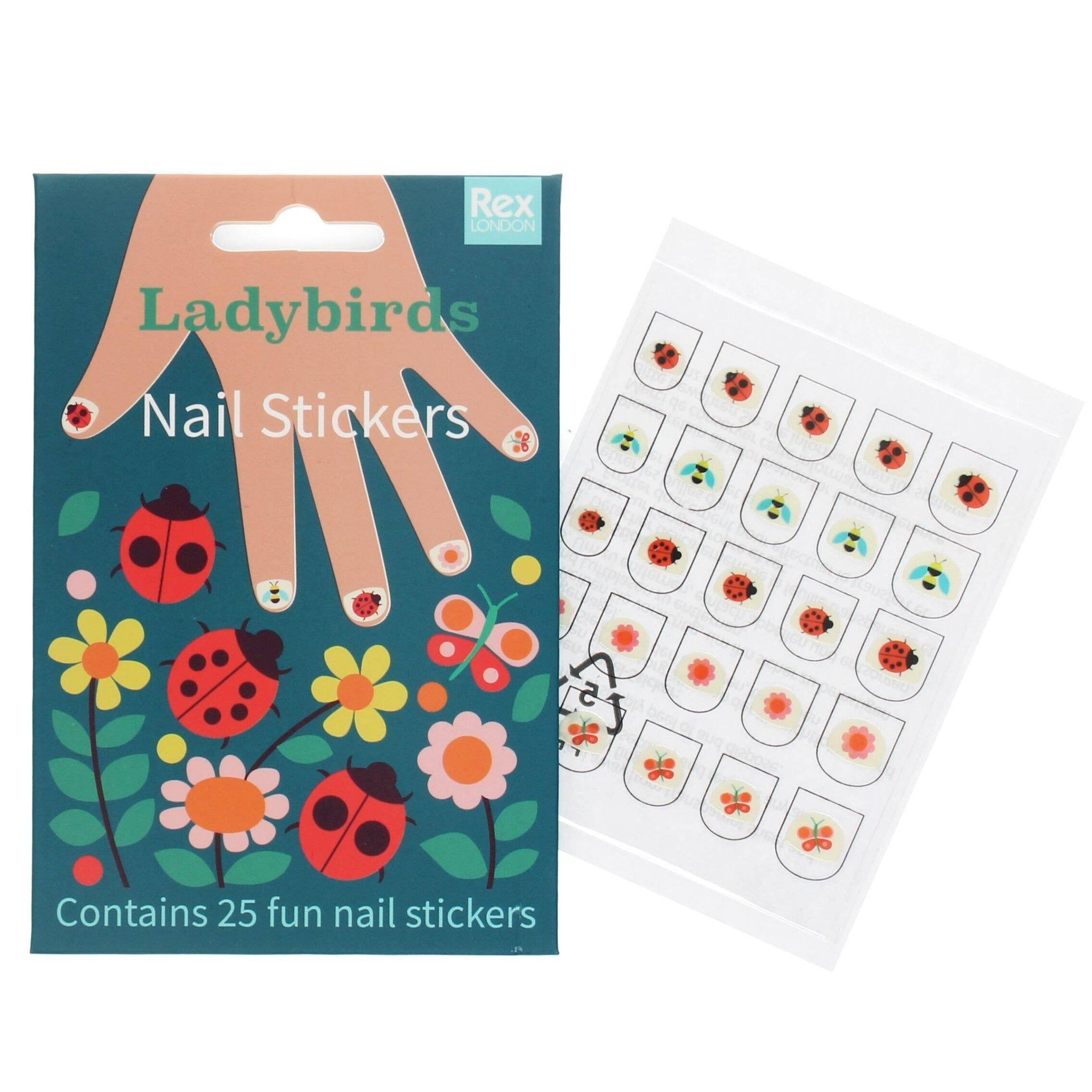 A pack of 25 nail stickers, each featuring an image such as a ladybird, bee, flower or butterfly from our Ladybird print.