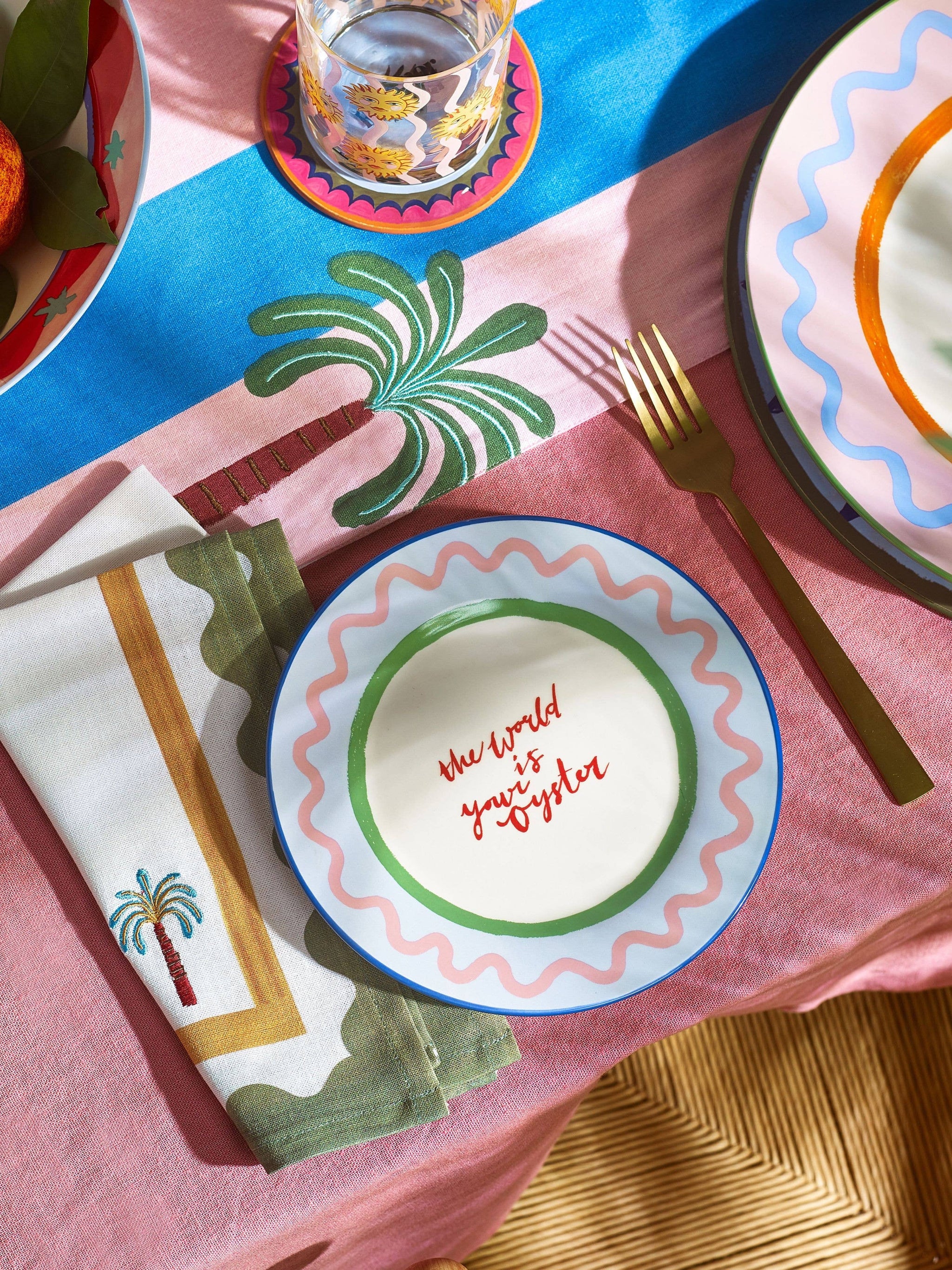 Introducing the pearl-fect new addition to your dinnerware collection. From British designer Eleanor Bowmer, the Electric Coast side plate features hand-illustrated squiggle designs and is complete with a 'The World is Your Oyster' slogan. Made from stoneware and finished in a glossy glaze, pair it with the Electric Coast dinner plate for a tablescape that is pure sunshine.