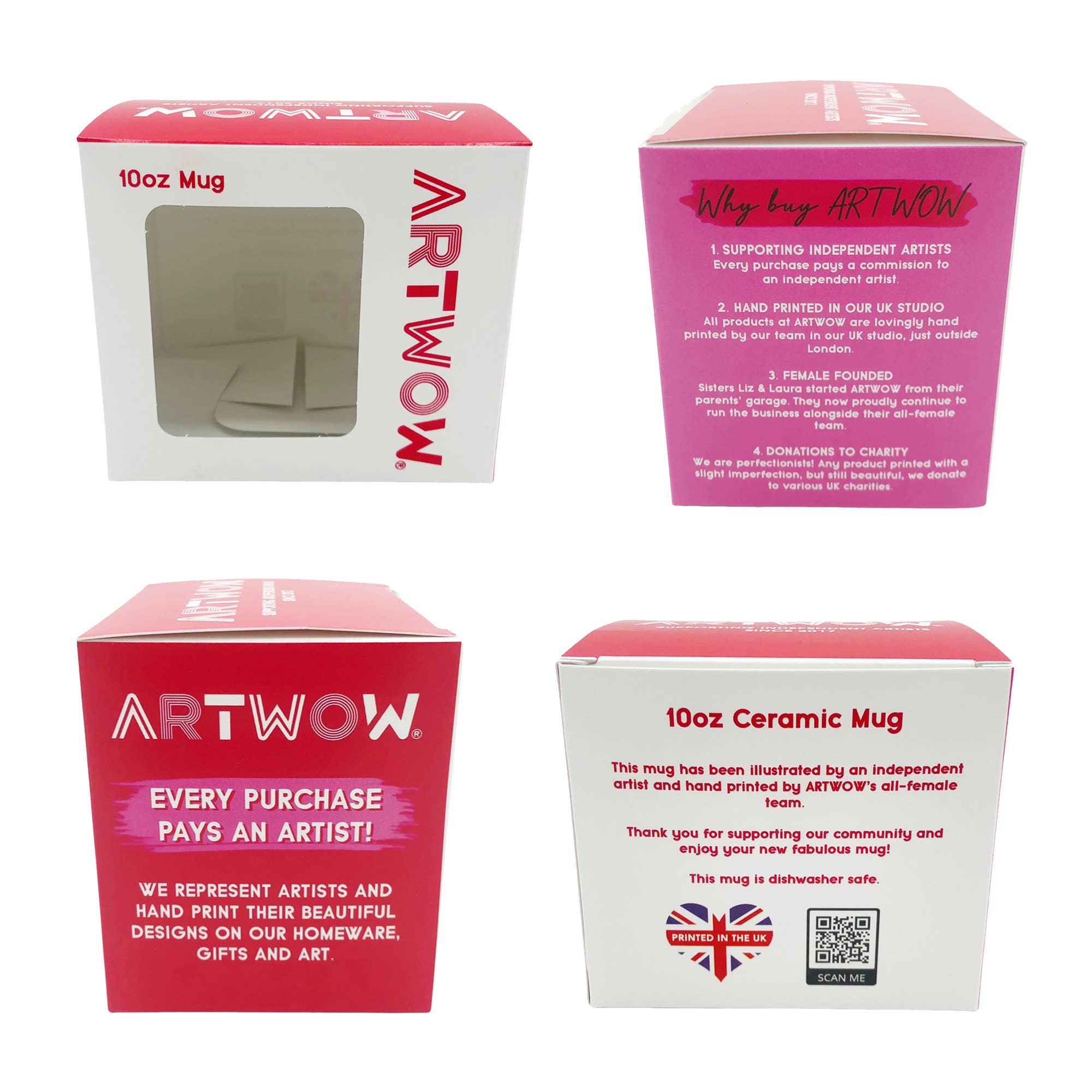 Our mug is a unique, premium ceramic 11oz coffee mug (height 9.6cm, diameter 8.2cm) with a high gloss finish. All with original wrap around imagery by our fabulous Art Wow artists. Mugs are dishwasher safe, however we do advise to hand wash to keep the longevity of the print. Each mug comes with its own ART WOW gift box!