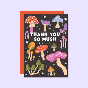 The card features a whimsical wonderland of multicoloured mushrooms, each intricately illustrated to capture the funky spirit of the design. From spotted toadstools to slender stems, the diversity of mushroom shapes and sizes creates a visually captivating forest floor that will delight recipients of all ages. Set against a backdrop that pops with colour, the playful pun "Thank You So Mush" takes centre stage, cleverly incorporating mushroom wordplay into a heartfelt message